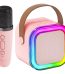 Mini aparat de Karaoke pentru Copii, Portabil, cu Microfon fara Fir, LED-uri Colorate, Roz, 3+ ani