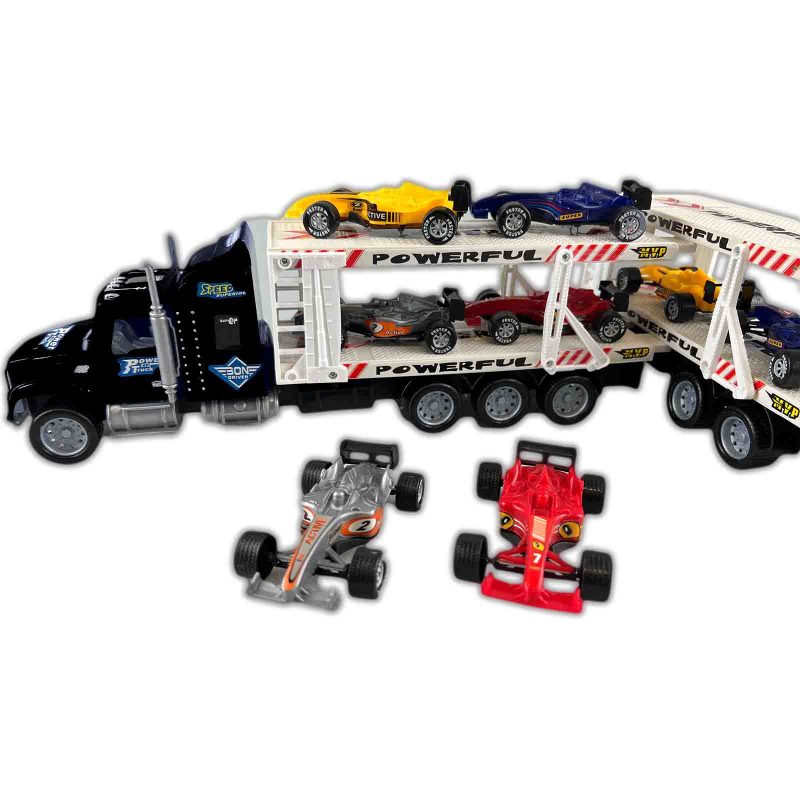 Tir de jucarie, camion cu remorca si 8 masinute de curse, Formula 1, 61 x 15 cm, Negru