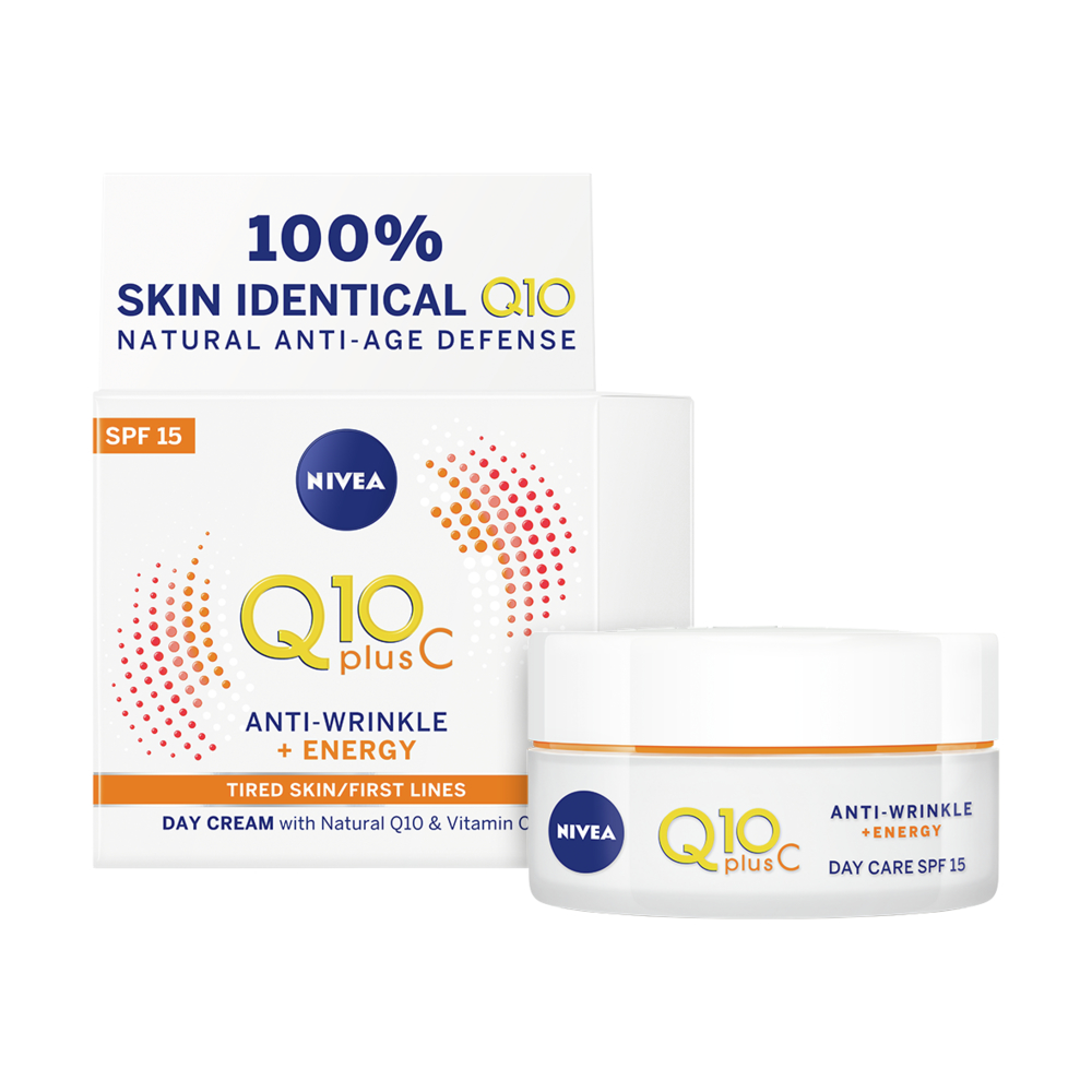 Q10 este un ingredient activ, propriu tenului. Odata cu inaintarea in varsta, cantitatea de coenzima Q10 produsa de organism scade si lasa tenul fara energie. Formula de ingrijire din crema de zi anti-rid NIVEA Q10 Plus C suplimenteaza rezervele tenului si previne aparitia ridurilor.