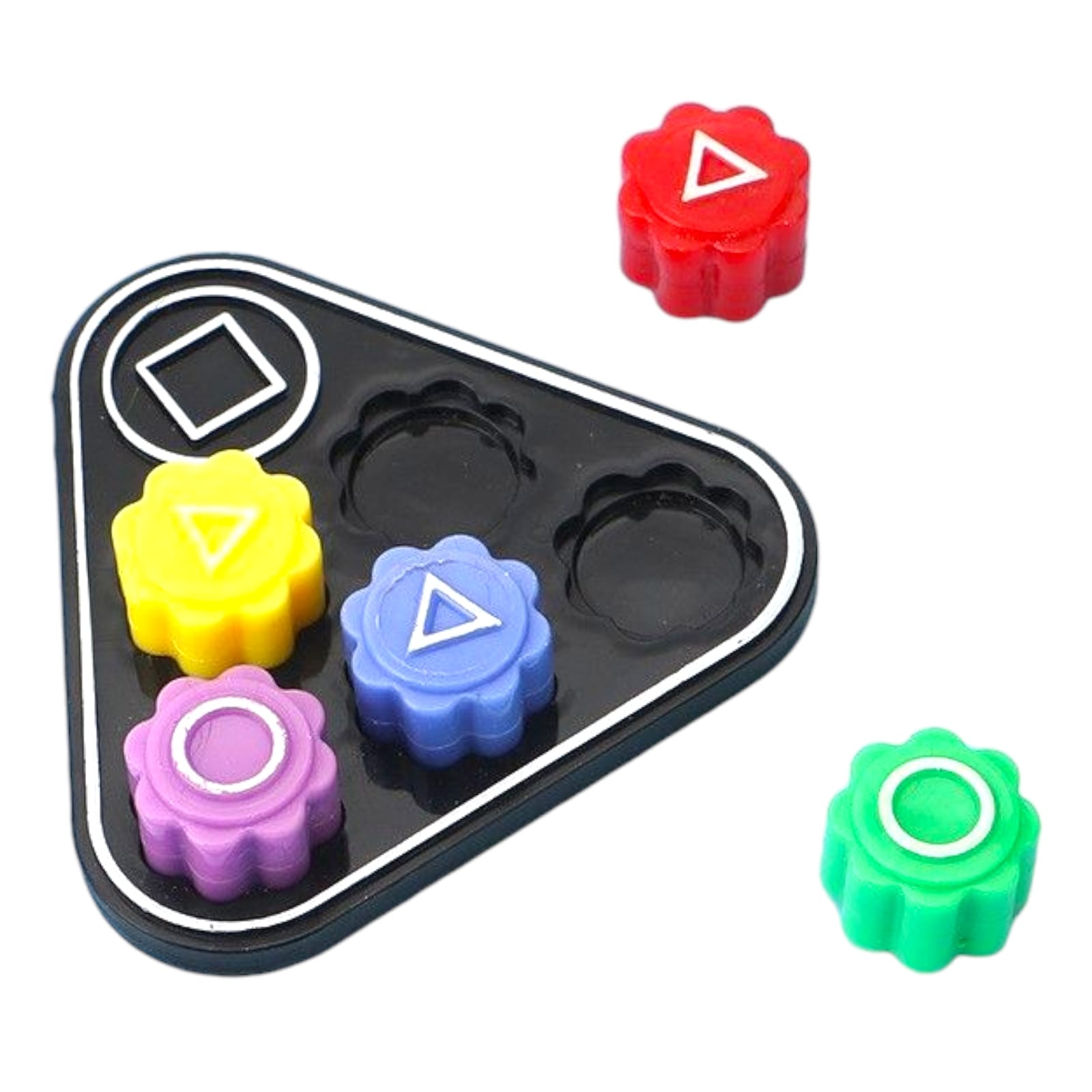 Joc de societate Traditional Coreean, Gonggi Tip Squid Game, pentru Dexteritate, Interactiv, Set 5 Piese Multicolore, Tabla Triunghiulara Neagra, 7 cm x 6.5 cm