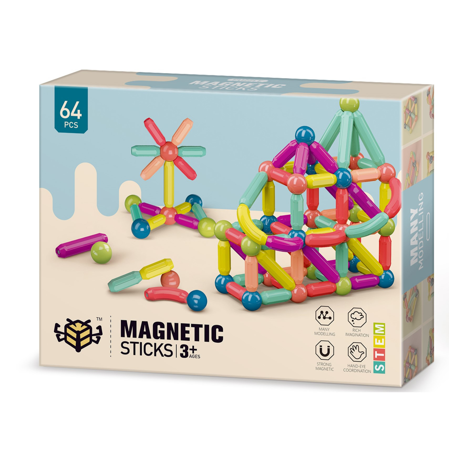 Set de Constructie Magnetic, Educativ STEM, 64 Piese, Multicolor, pentru Copii 3+ ani